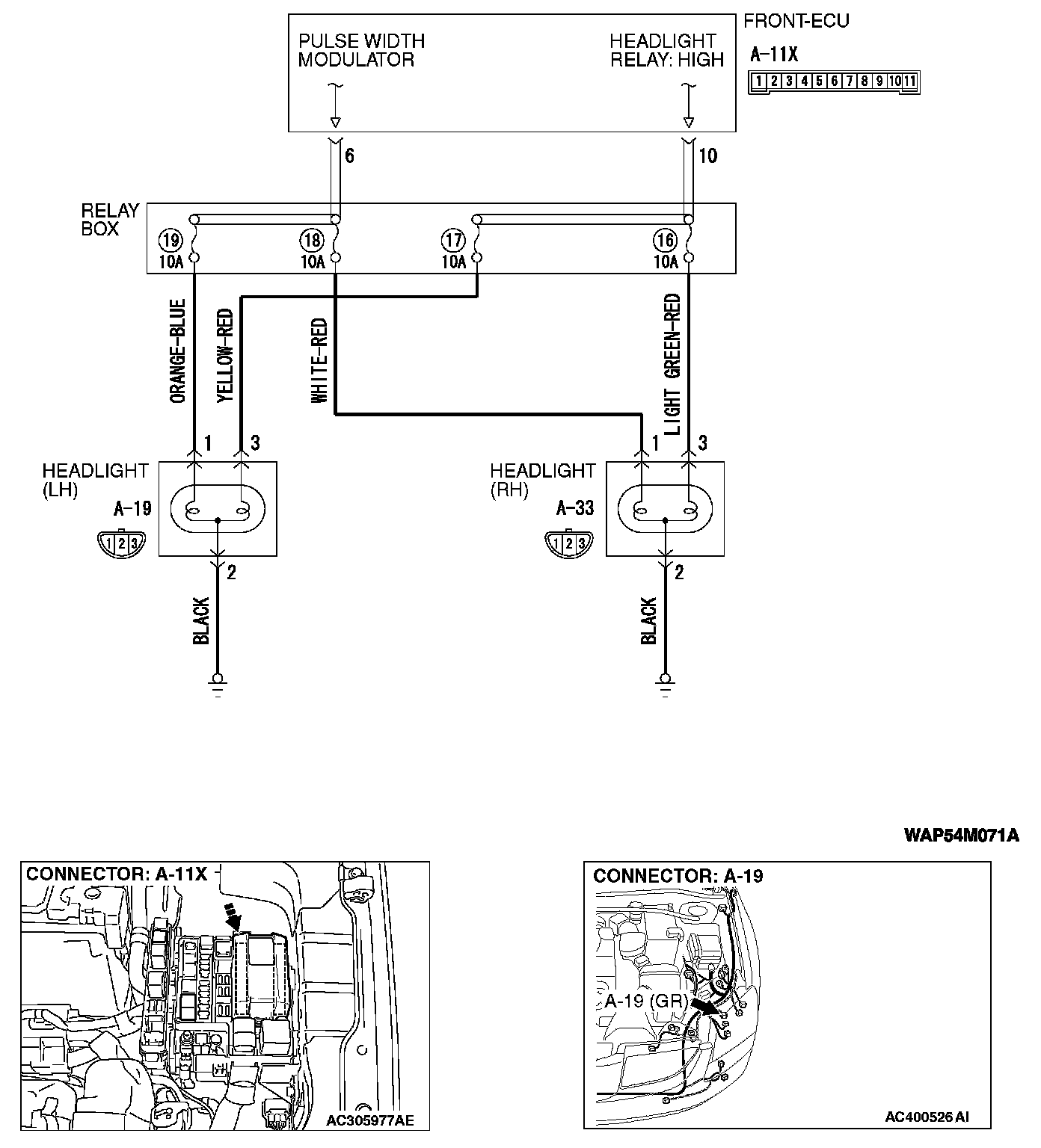 STEP 10. Check the wiring harness between headlight (LH) connector A-19 (terminal 1) and front-ECU connector A-11X (terminal 6).