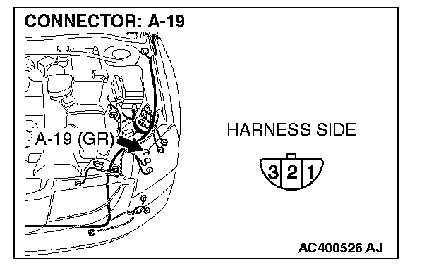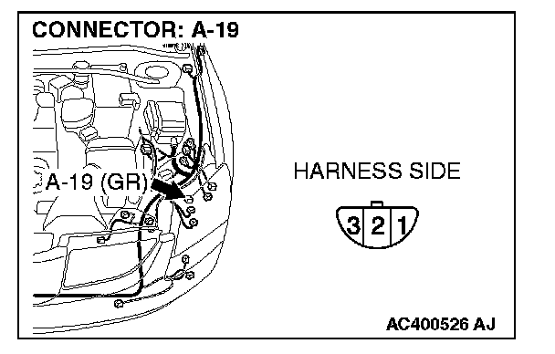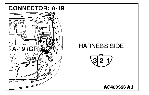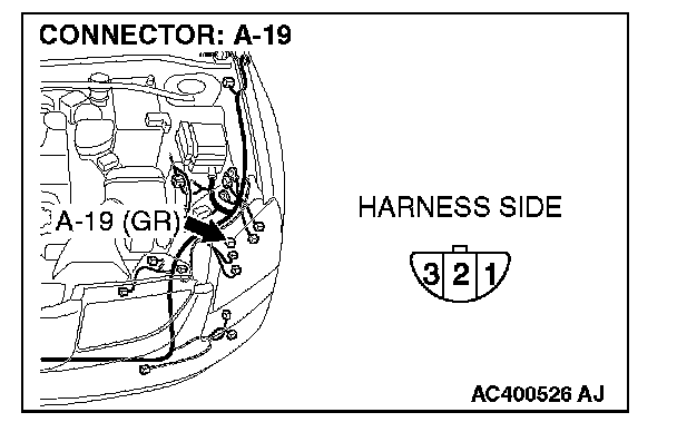 STEP 2. Check headlight (LH) connector A-19 for loose, corroded or damaged terminals, or terminals pushed back in the connector.