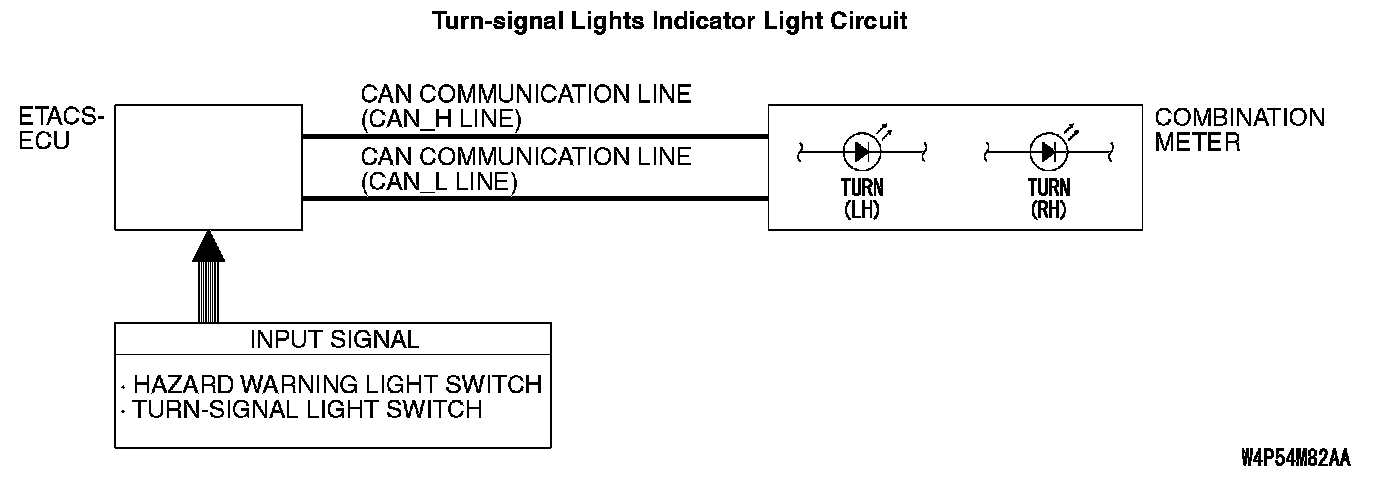 At the same time that the turn-signal lights are illuminated, the ETACS-ECU sends a signal to illuminate the turn-signal light indicator via the CAN bus line.