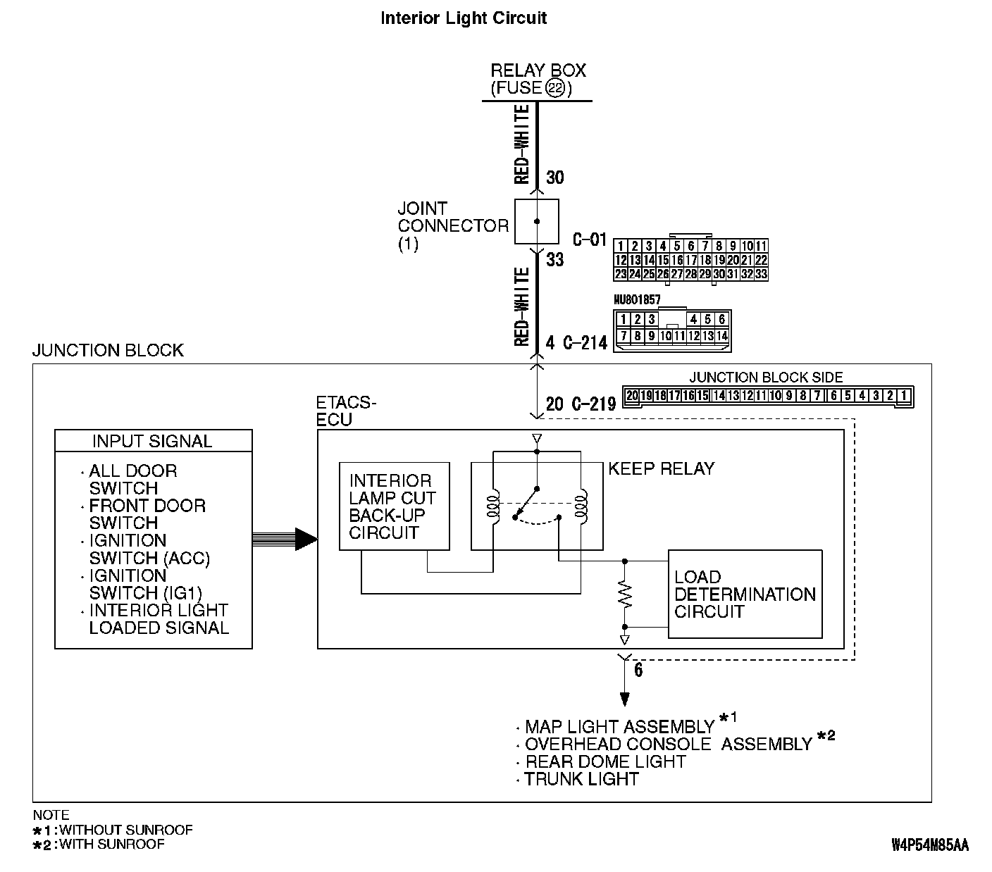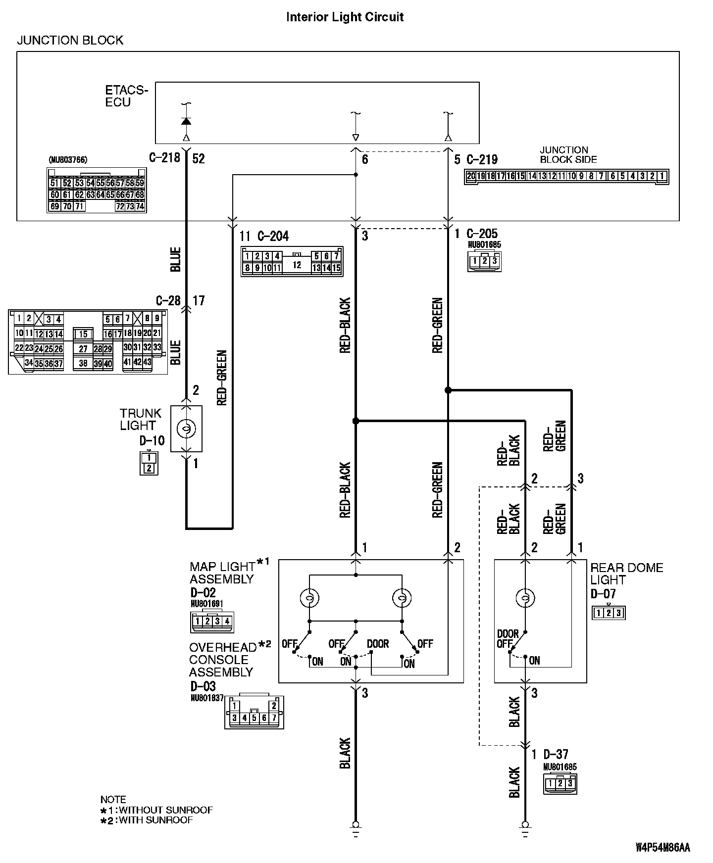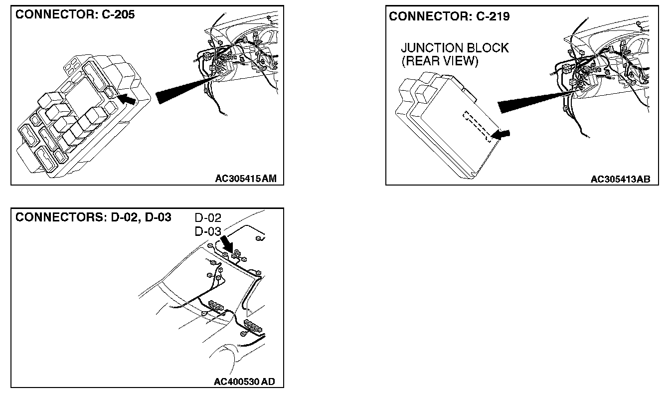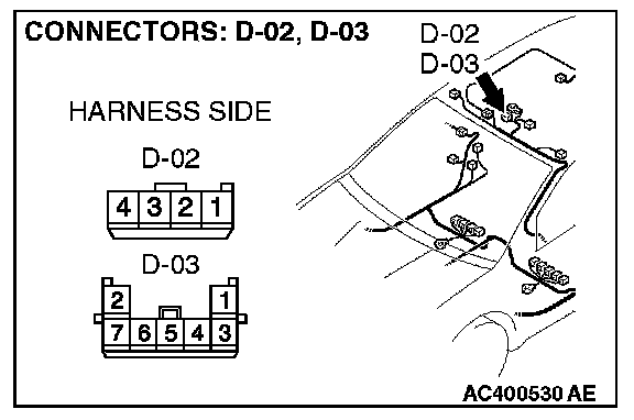 STEP 5. Check the wiring harness between map light assembly connector D-02 (terminal 1) [without sunroof] or overhead console assembly connector D-03 (terminal 1) [with sunroof] and ETACS-ECU connector C-219 (terminal 6).