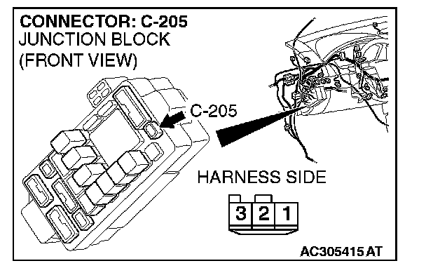 NOTE: Also check junction block connector C-205 for loose, corroded, or damaged terminals, or terminals pushed back in the connector. If junction block connector C-205 is damaged, repair or replace the damaged component(s).