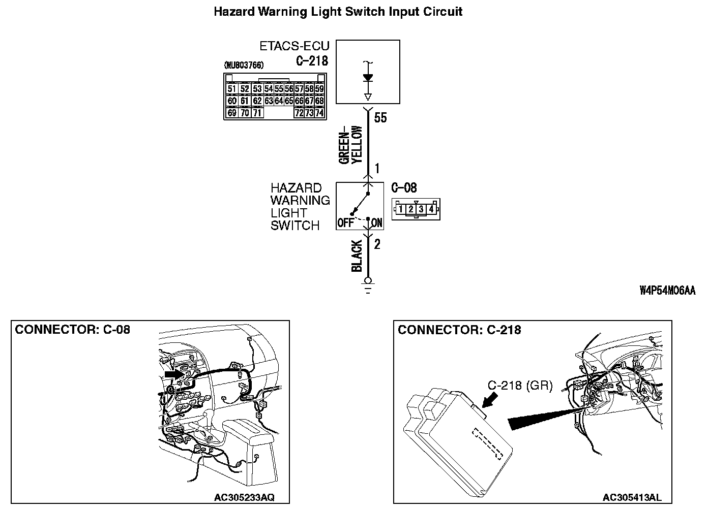 STEP 6. Check the wiring harness between hazard warning light switch connector C-08 (terminal 1) and ETACS-ECU connector C-218 (terminal 55).