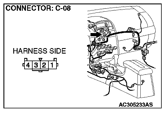1. Disconnect hazard warning light switch connector C-08 and measure the resistance available at the wiring harness side of the connector.
