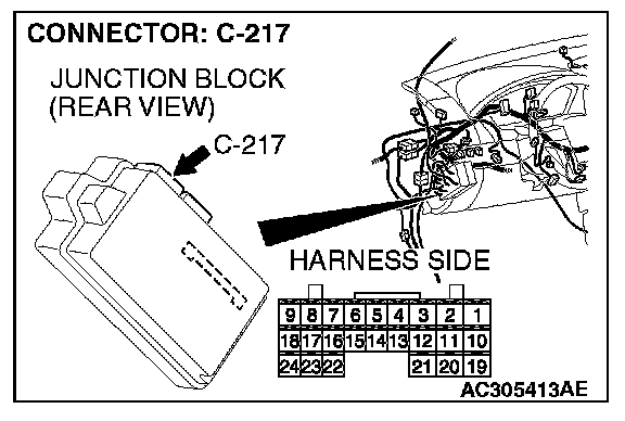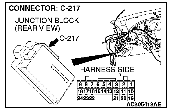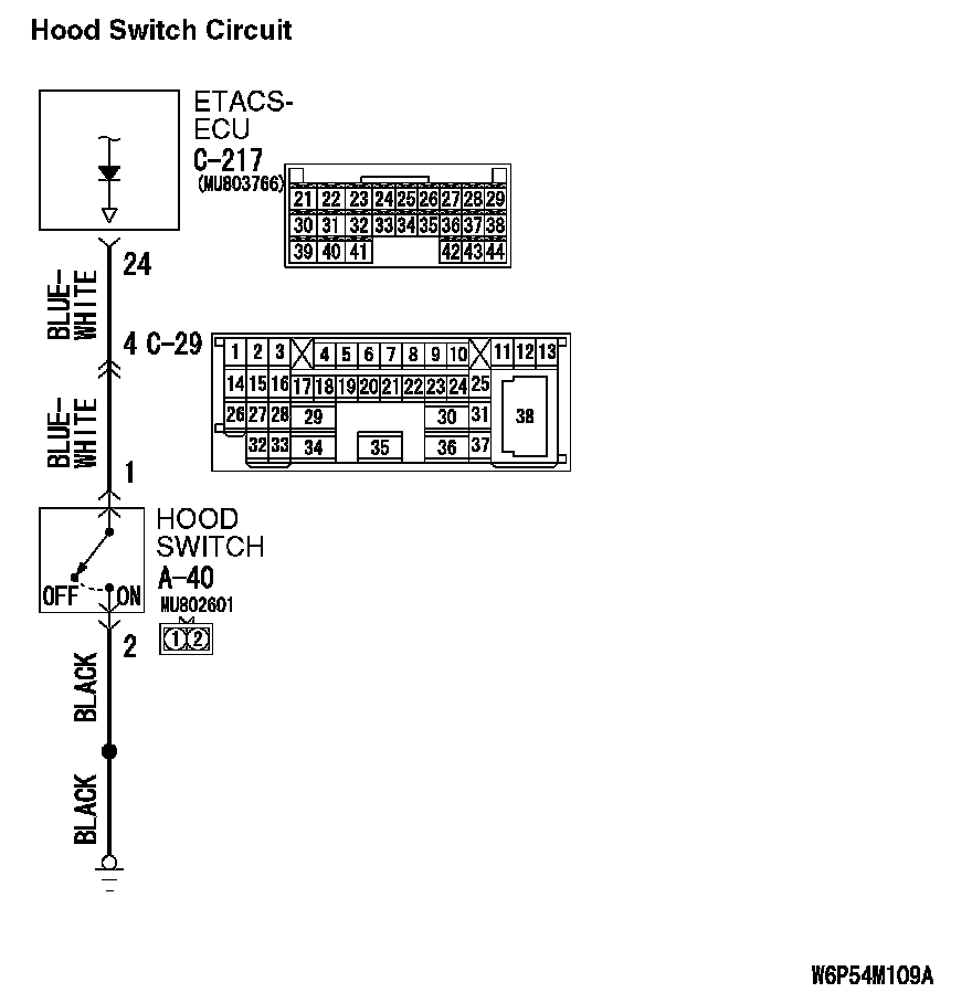 STEP 6. Check the wiring harness between hood switch connector A-40 (terminal 1) and ETACS-ECU connector C-217 (terminal 24).