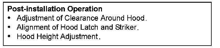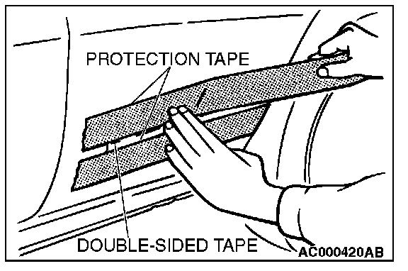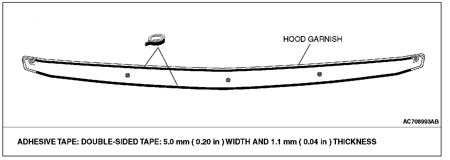 NOTE: If the double-sided tape is difficult to affix in cold temperature, etc., warm the bonding surfaces of the hood and hood garnish to about 40 - 60 °C (104 - 140 °F) before affixing the tape.