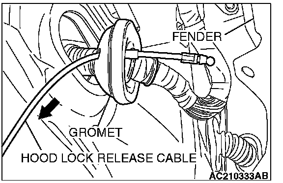 NOTE: If you attempt to pull out the hood lock release cable in the opposite direction, the end of the hood lock release cable will engage the grommet and prevent cable removal.