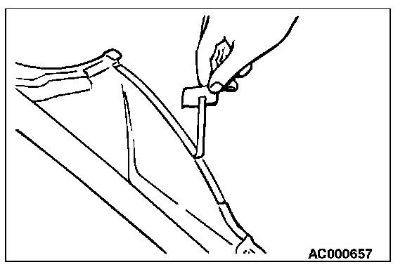 Release the grommet as shown, and pull out the hood lock release cable in the arrow direction (passenger compartment side).