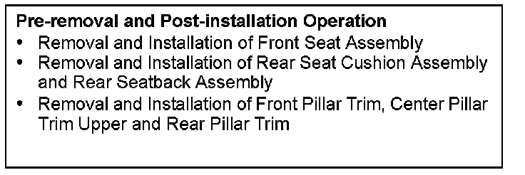 WARNING: When removing and installing the front passenger seat, be sure to carry out accuracy check occupant classification sensor after the seat has been installed in the vehicle. (Refer to SRS, On-Vehicle Service.)