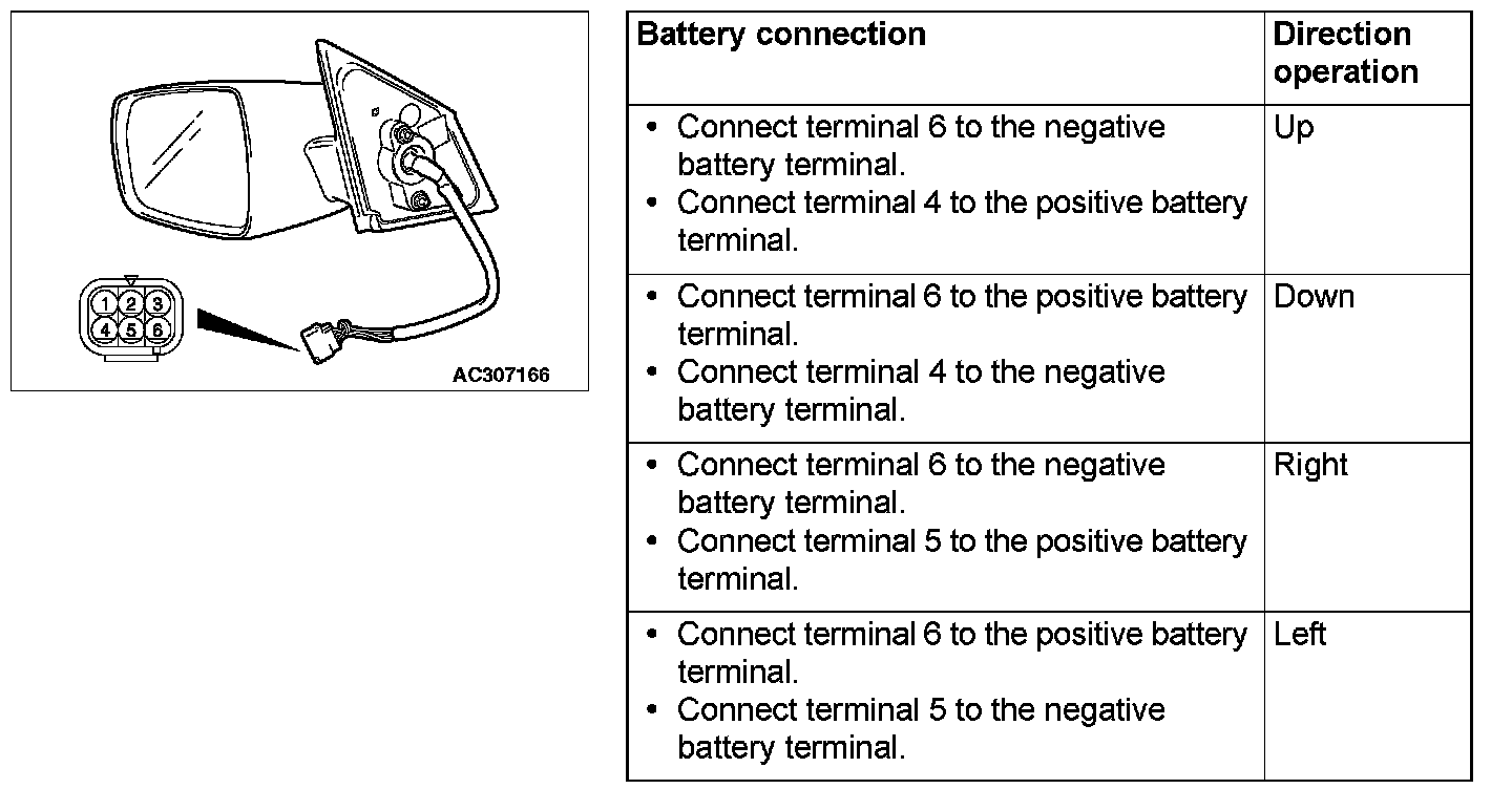 Check that the mirror moves as described in the table when each terminal is connected to the battery.