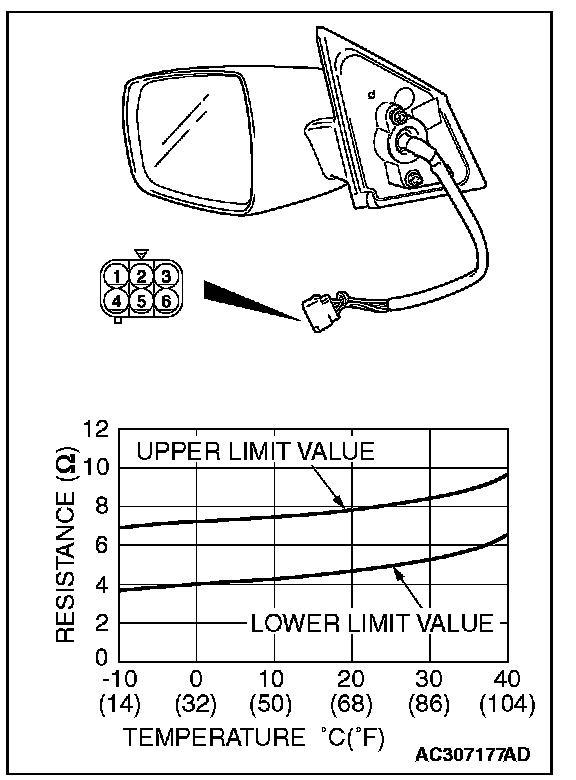 Check to see that the resistance shown in the graph is almost satisfied when measuring the resistance of terminal 1 and 3 of the door mirror connectors.
