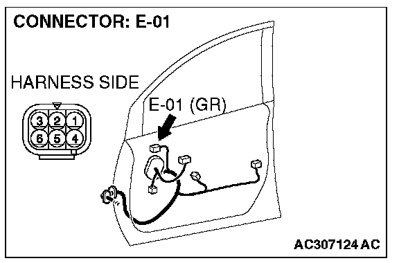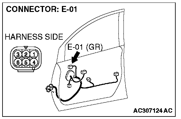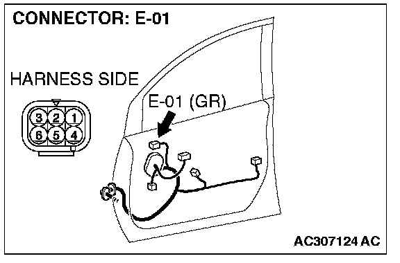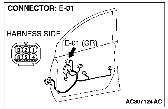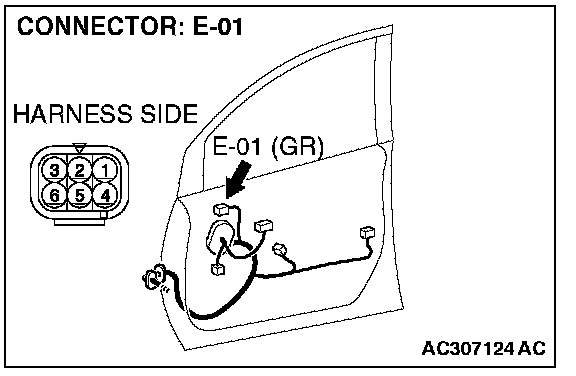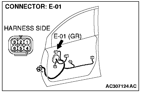 1. Disconnect remote controlled mirror (RH) connector E-01, and check at the wiring harness side connector.