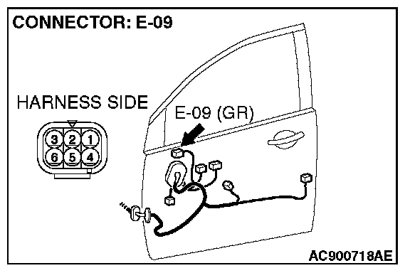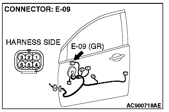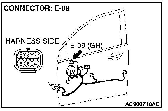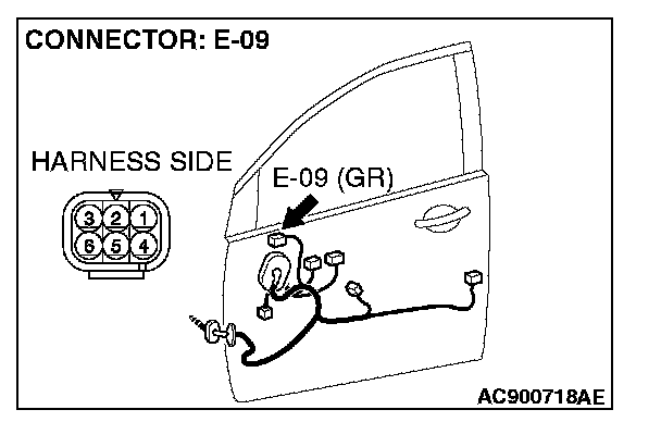1. Disconnect remote controlled mirror (LH) connector E-09 and check at the wiring harness side connector.