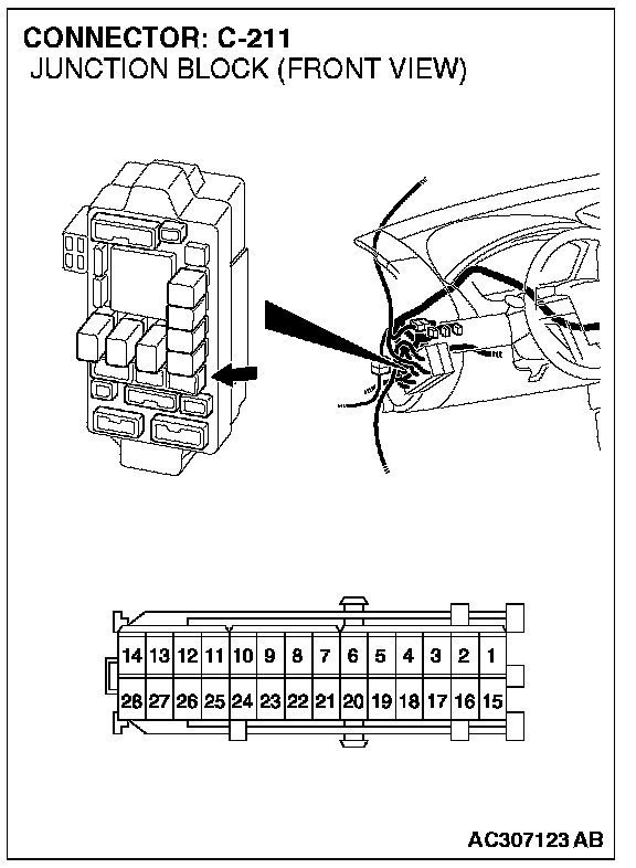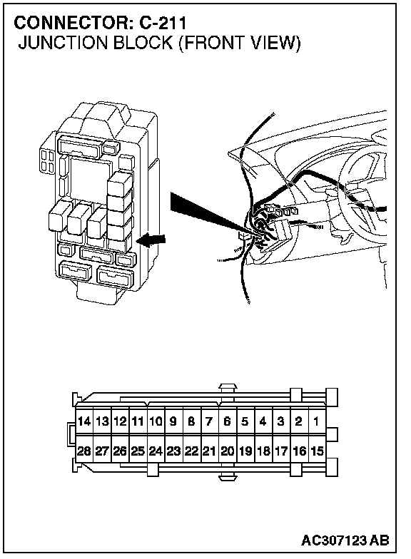 STEP 12. Check junction block C-211 for loose, corroded damaged terminal, or terminals pushed back in the connector.