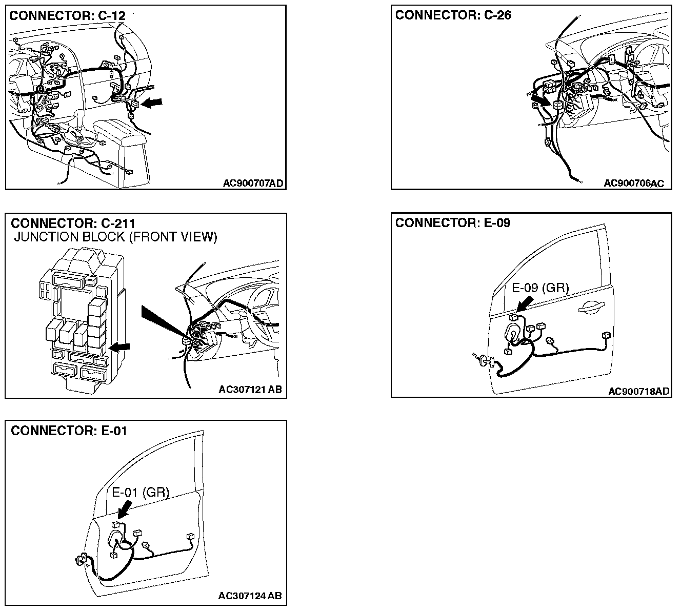 STEP 2. Check the remote controlled mirror (RH) connector E-01 and junction block connector C-211 for loose, corroded or damaged terminals, or terminals pushed back in the connector.