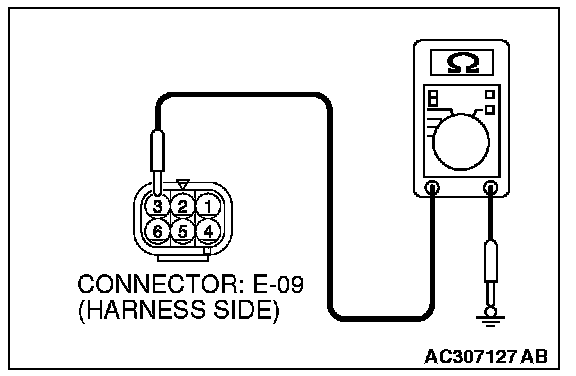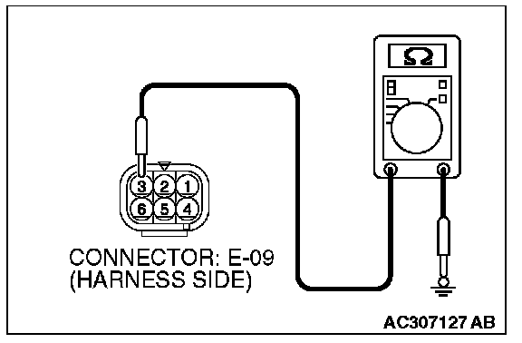 STEP 4. Check the ground circuit to between remote controlled mirror (LH) connector E-09 and ground for open circuit. Measure the resistance at remote controlled mirror (LH) connector E-09.