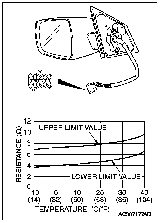 Check to see that the resistance shown in the graph is almost satisfied when measuring the resistance between terminal 1 and 3 of the remote controlled mirror (LH) connector E-09.