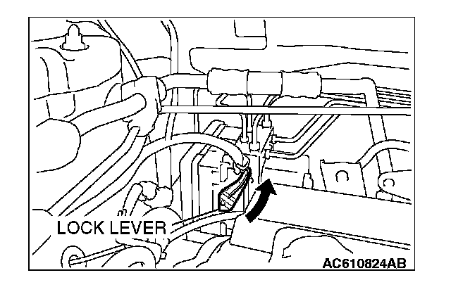 Move the lock lever of the TCL/ASC-ECU connector as shown in the illustration, and then disconnect the harness connector.