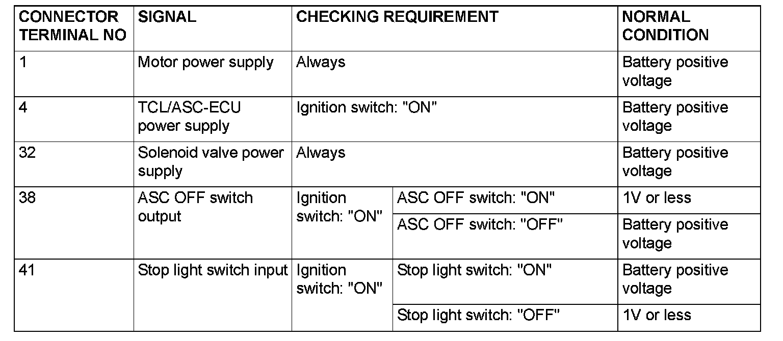 NOTE: Do not measure terminal voltage for approximately three seconds after the ignition switch is turned "ON. " The TCL/ASC-ECU performs the initial check during that period.