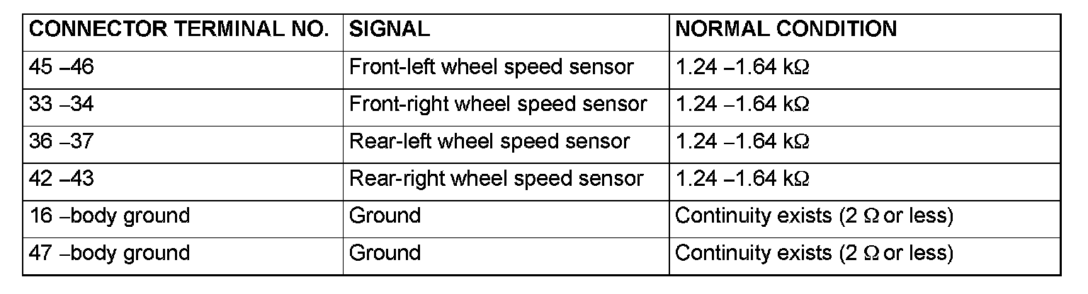 2. Measure the resistance and continuity between the terminals indicated in the table below.