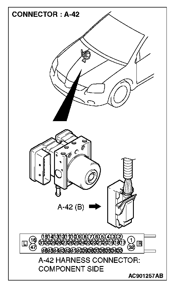 2. Disconnect the TCL/ASC-ECU connector A-42, and then use special tool MB991997 to measure the output voltage at the harness side connector.