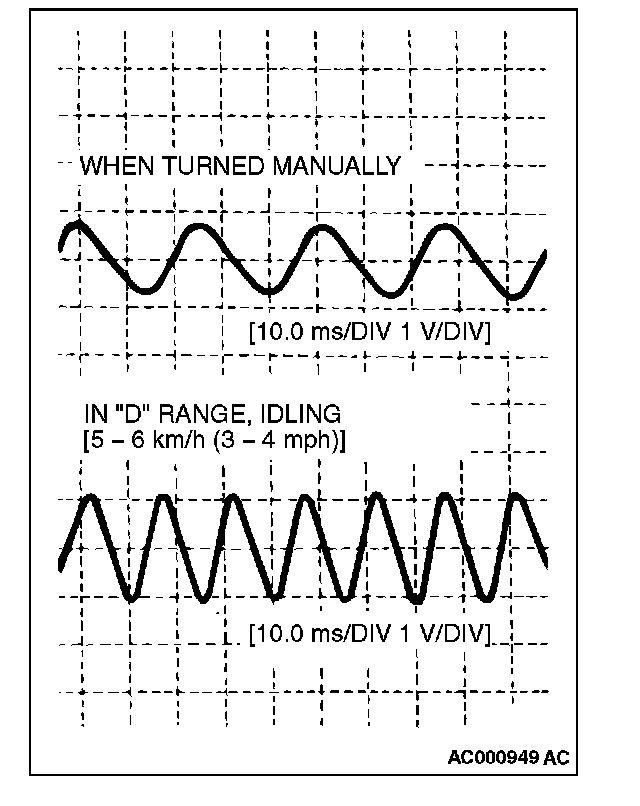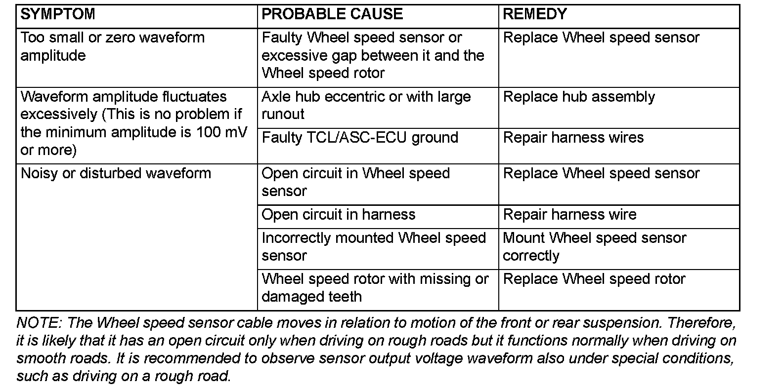 NOTE: The output waveform is low when the wheel speed is low. Similarly, it will be higher as the wheel speed increases. Waveform may also be observed by driving the vehicle.