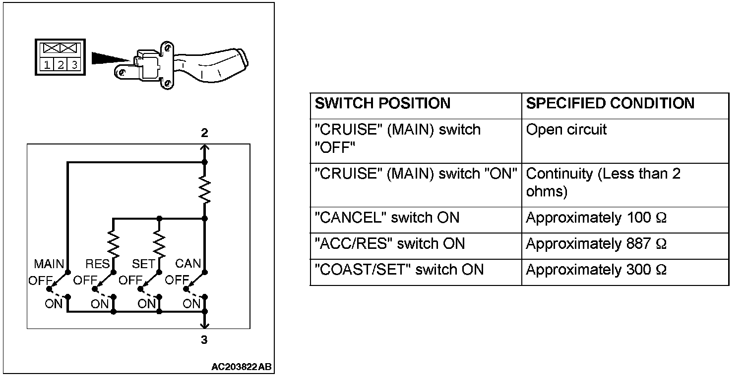 2. Measure the resistance between terminal 2 and terminal 3 when each of the "COAST/SET", "ACC/RES", "CANCEL" and "CRUISE" (MAIN) switches is pressed. If measure values measured at the time correspond to those in the table below, the resistance values are correct.