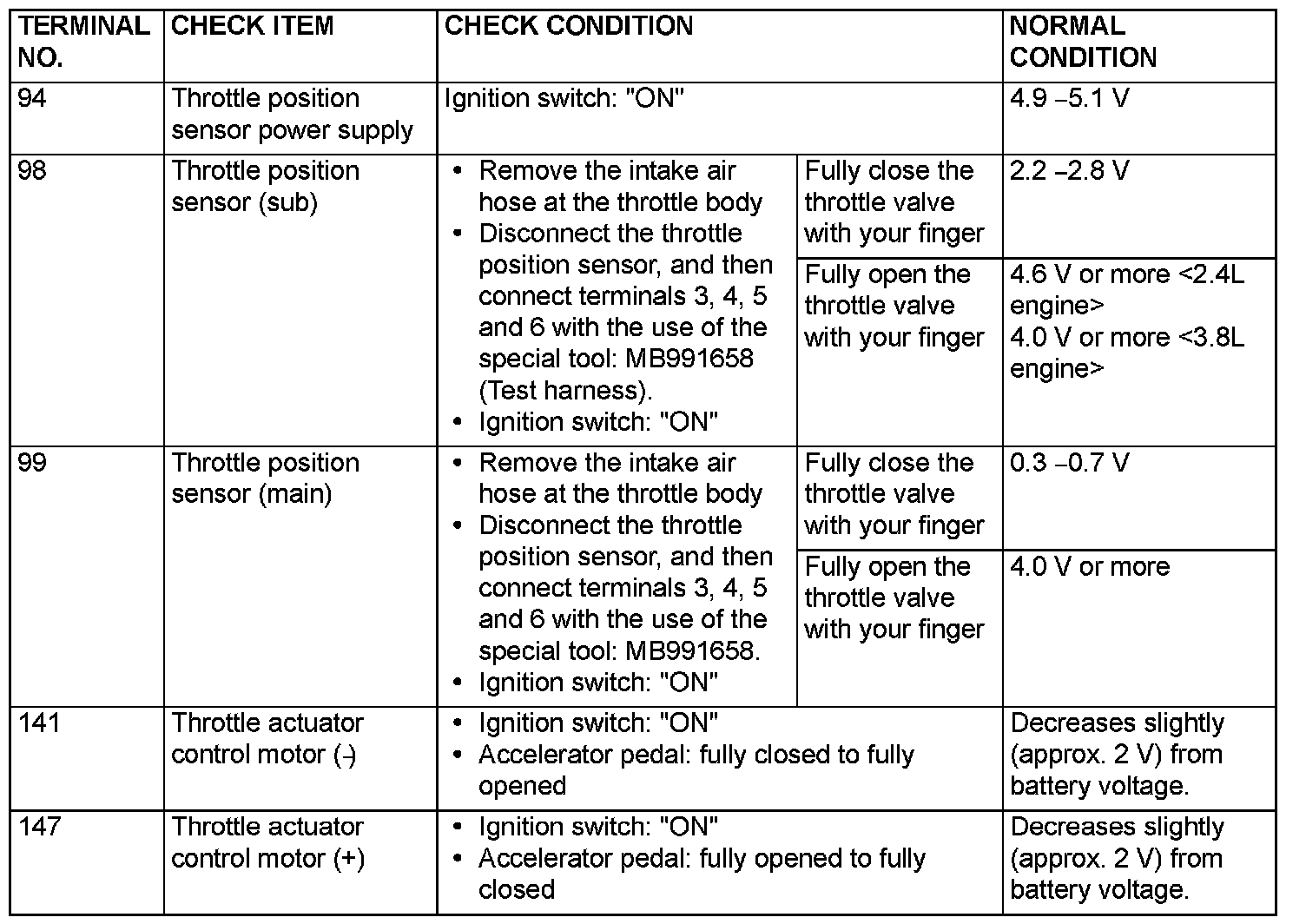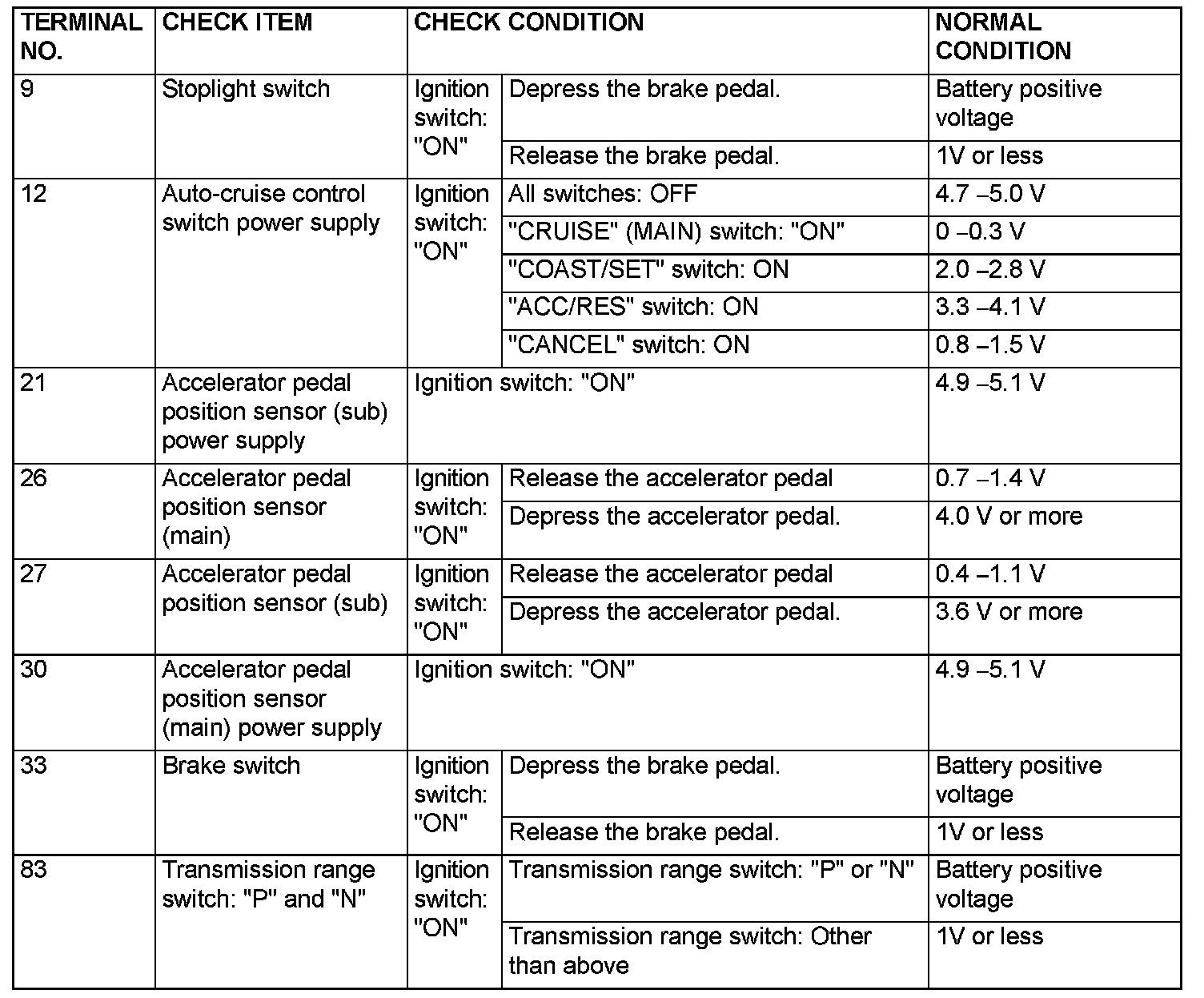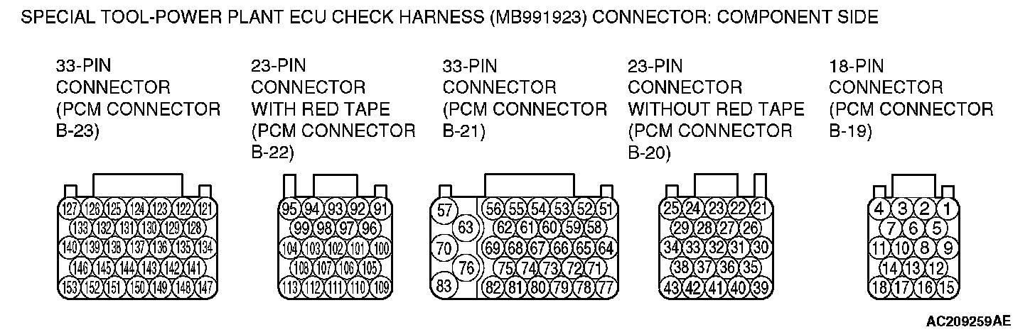 PCM TERMINAL VOLTAGE REFERENCE CHART FOR AUTO-CRUISE CONTROL SYSTEM OPERATION1. Disconnect the PCM connectors, and connect special tool MB991923 (Power plant ECU check harness) in between.
