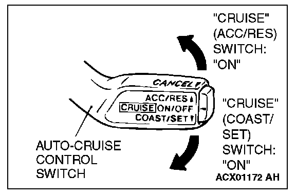 HOW TO READ DIAGNOSTIC TROUBLE CODES1. Turn the ignition switch to the "ON" position while holding the auto-cruise control switch down to the "COAST/SET" position. Then, within one second, more the cruise control switch up to the "ACC/RES" position.
