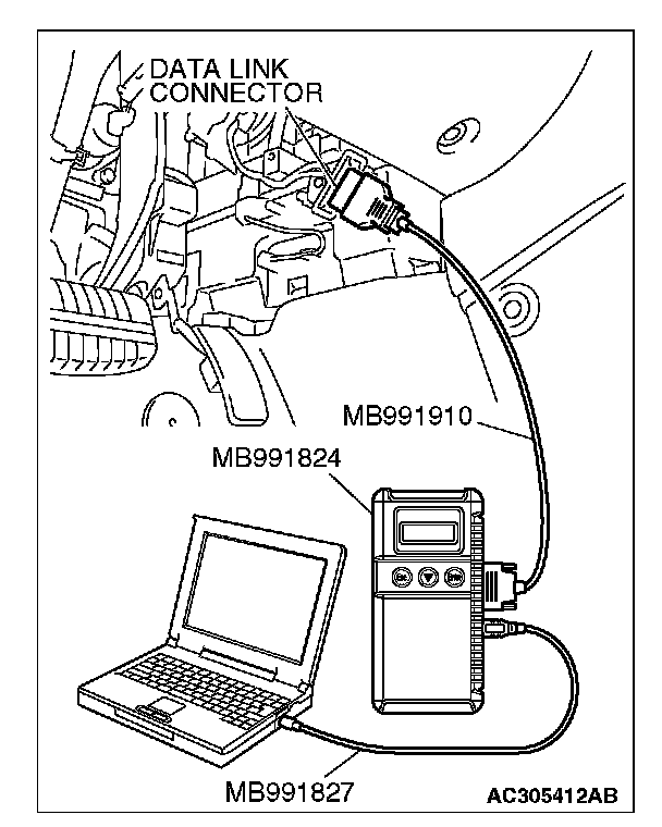 2. Turn the ignition switch to the "LOCK" (OFF) position and connect the scan tool MB991958 to the data link connector.