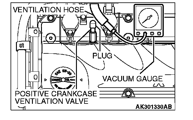 3. Disconnect the ventilation hose from the positive crankcase ventilation (PCV) valve, and then connect a vacuum gauge to the ventilation hose. Plug the PCV valve.