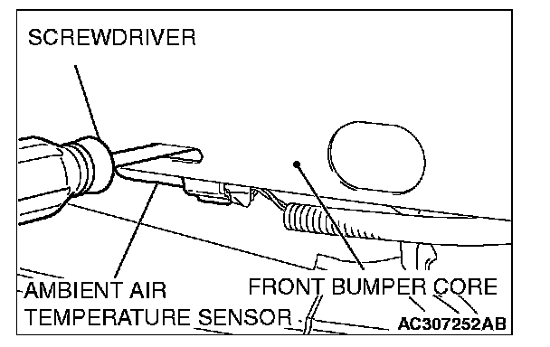 Insert a screwdriver into the mounting hole of the front bumper core to release the clip, and remove the ambient air temperature sensor.