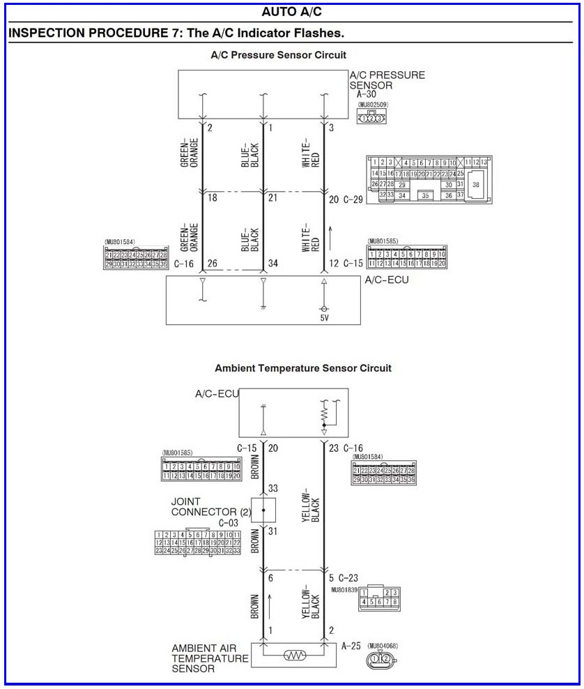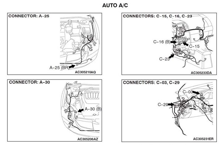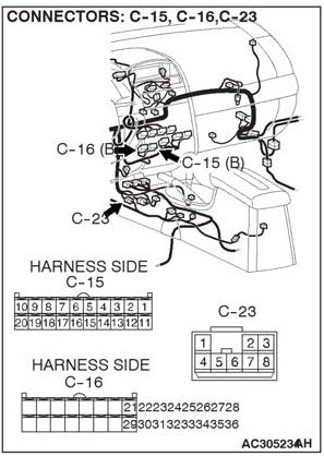 STEP 10. Check the wiring harness between A/C-ECU connector C-15 (terminal 20), C-16 (terminal 23) and ambient air temperature sensor connector A-25 (terminals 1 and 2).