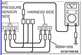 2. Disconnect the A/C pressure Sensor connector and connect special tool test harness MB991958 as shown in the illustration.
