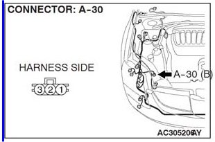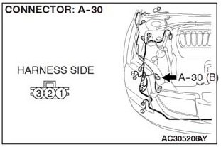 STEP 3. Check A/C pressure sensor connector A-30 for loose, corroded or damaged terminals or terminals pushed back in the connector.
