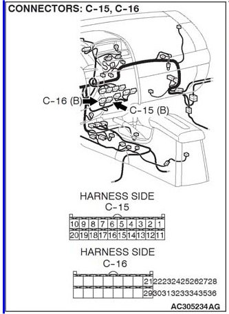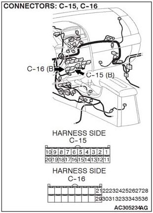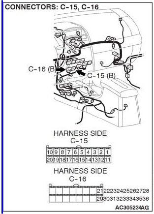 STEP 5. Check A/C-ECU C-15 and C-16 for loose, corroded or damaged terminals or terminals pushed back in the connector.