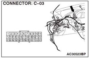 NOTE: Also check intermediate connector C-23 and joint connector C-03 for loose, corroded, or damaged terminals or terminals pushed back in the connector. If intermediate connector C-23 orjoint connector C-03 is damaged, repair or replace the connector as described in Harness Connector Inspection.