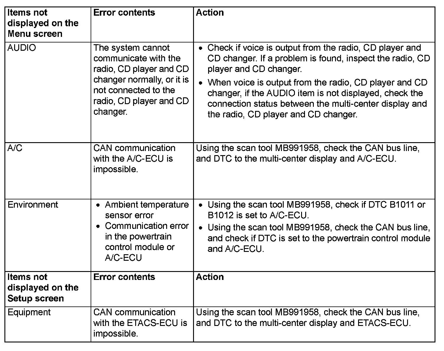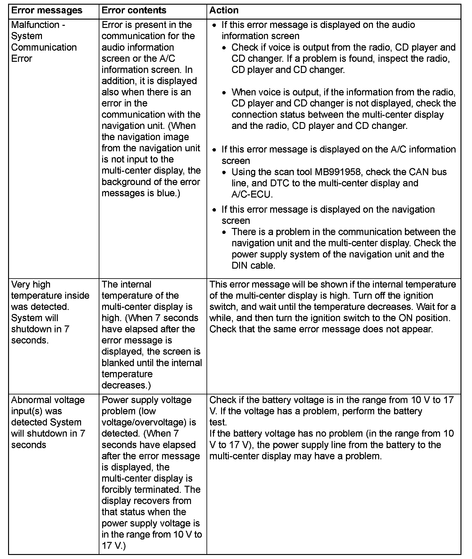 ERROR MESSAGEThe multi-center display shows the error messages below if an abnormality is present in itself or communications. If the information of items on the menu/setup screen cannot be obtained, the items are not displayed.
