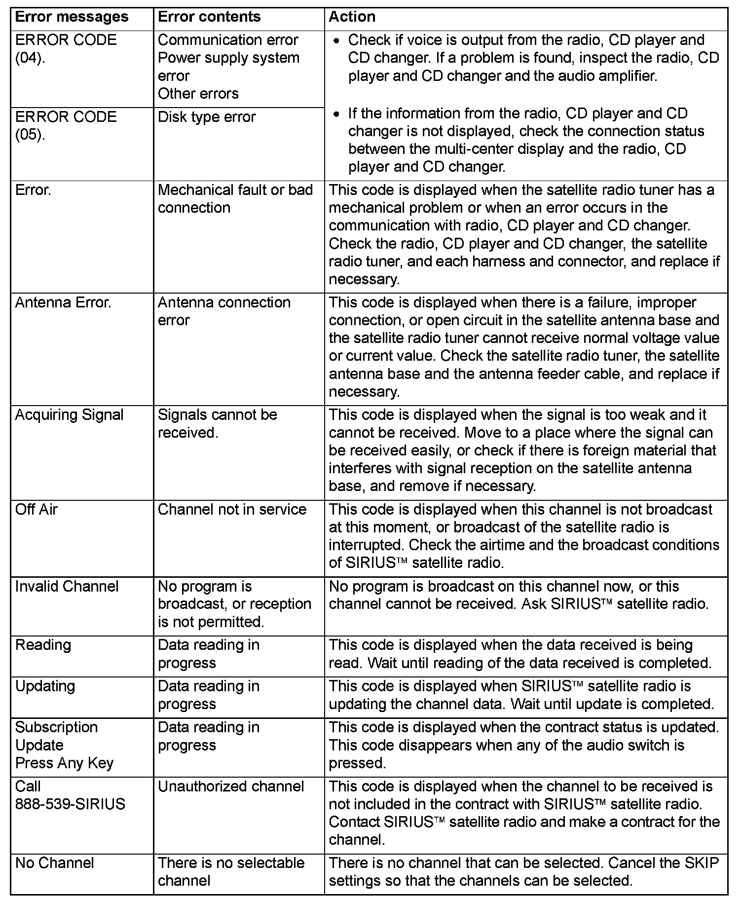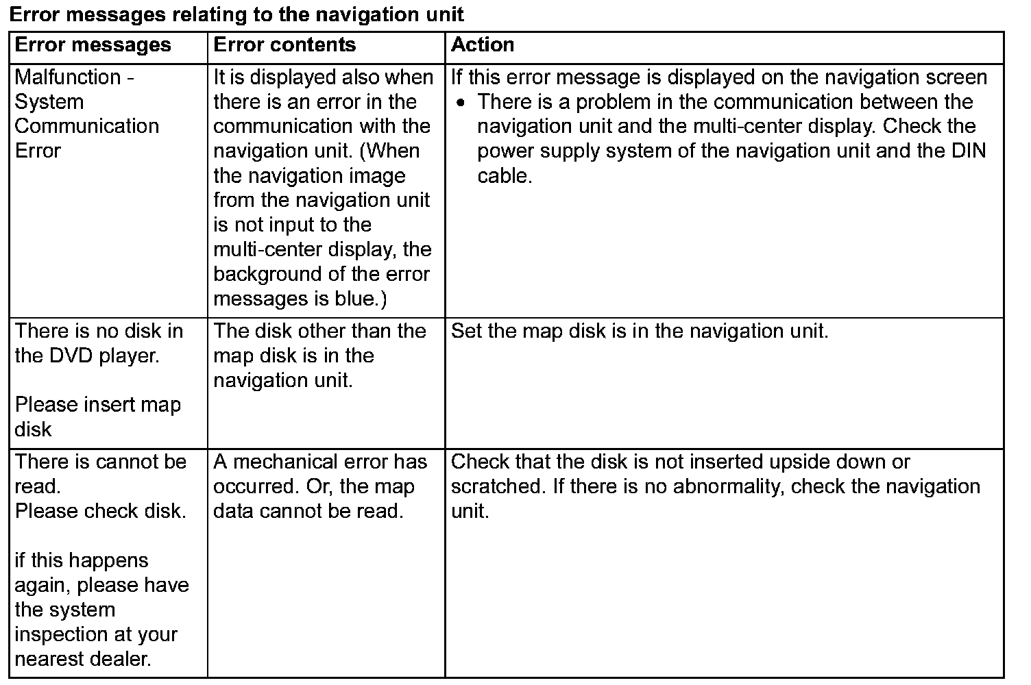 Error messages relating to the navigation unit