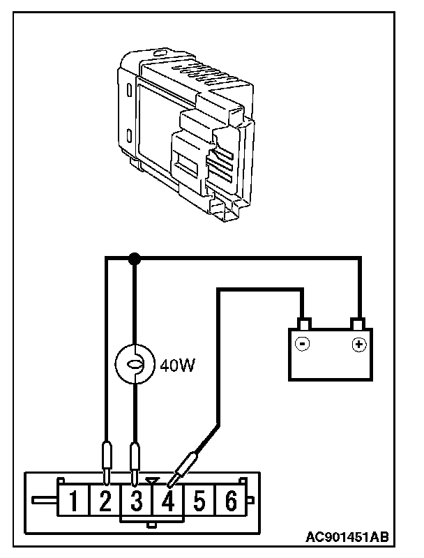 1. Connect the battery and the test bulb (40W) as shown in the illustration.