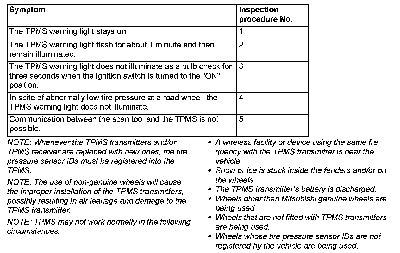 TPMS SYMPTOM CHART