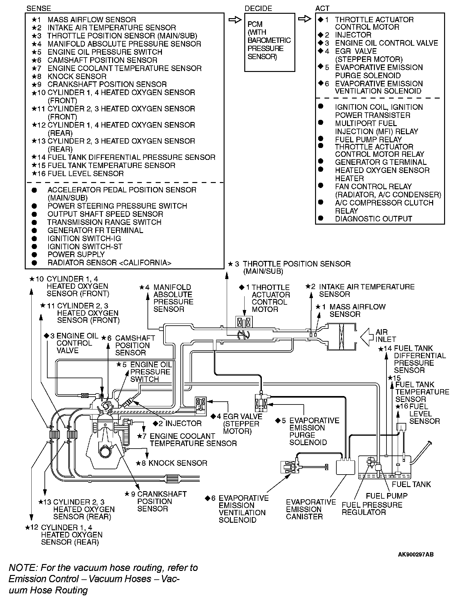 GENERAL DESCRIPTIONThe Multiport Fuel Injection System consists of sensors, actuators and the powertrain control module (PCM). The sensors detect the engine condition. The PCM controls the system based on signals from these sensors. The actuators work under the control of the PCM. The PCM carries out activities such as fuel injection control, throttle valve opening control, idle air control, and ignition timing control. In addition, the PCM has several diagnostic test modes which simplify troubleshooting when a problem develops.
