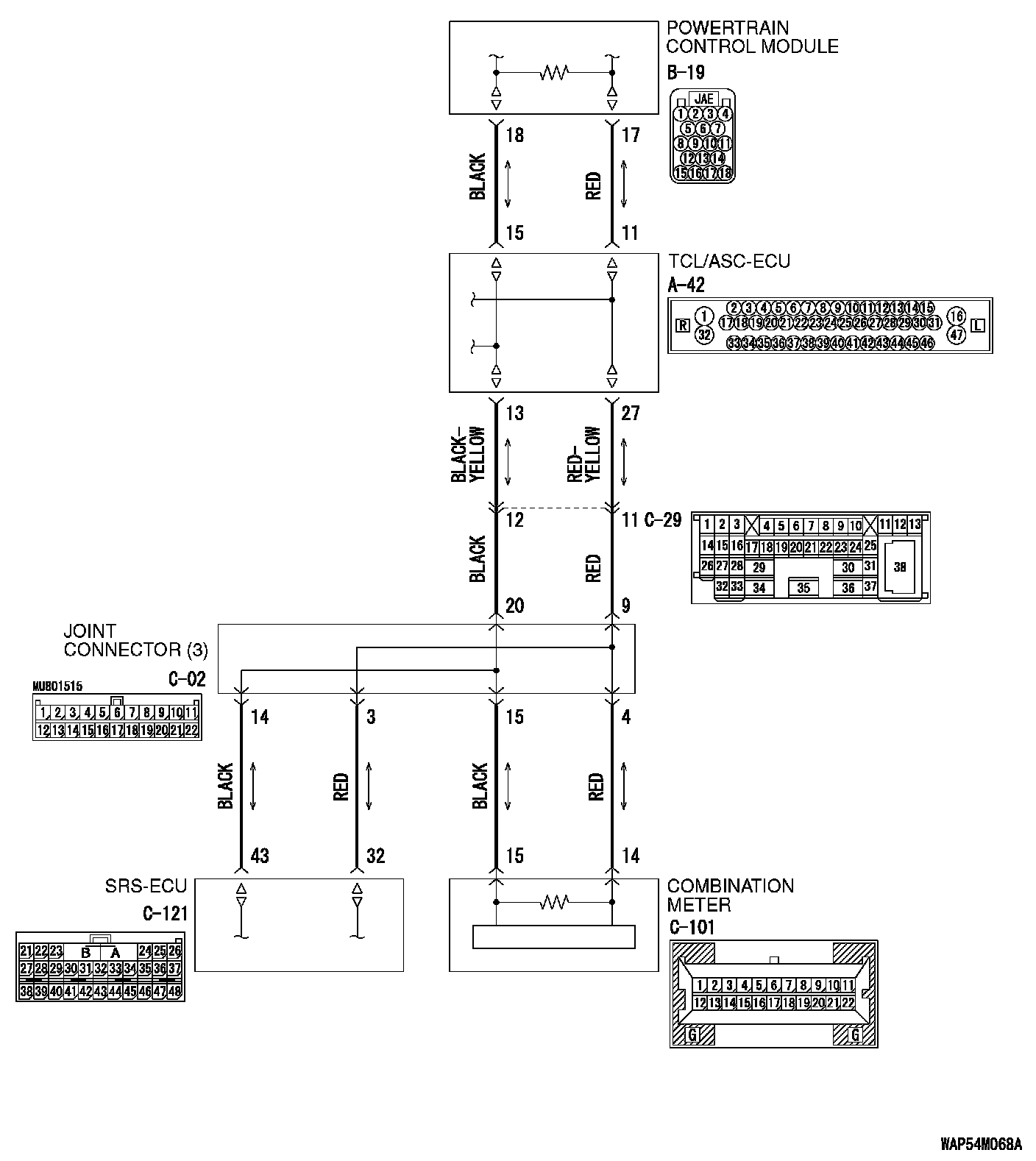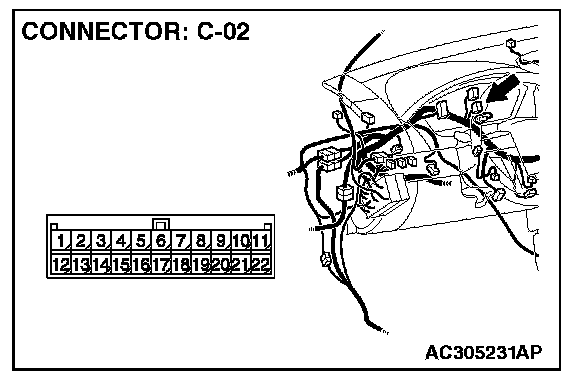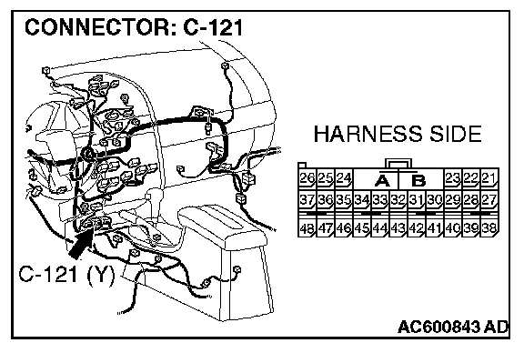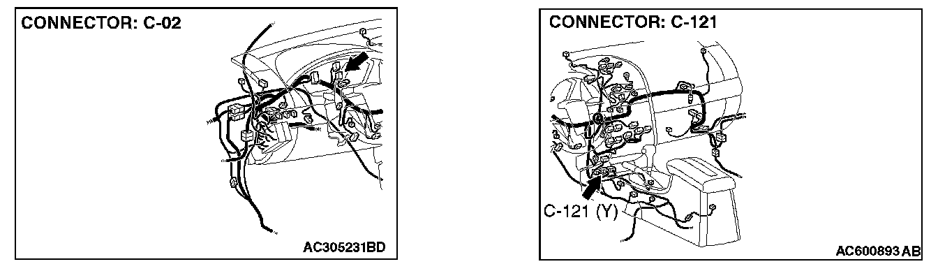 STEP 1. Check joint connector (3) C-02 and SRS-ECU connector C-121 for loose, corroded or damaged terminals, or terminals pushed back in the connector.