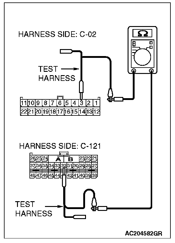 STEP 2. Check the CAN bus lines between joint connector (3) and the SRS-ECU. Measure the resistance between joint connector (3) C-02 and SRS-ECU connector C-121.
