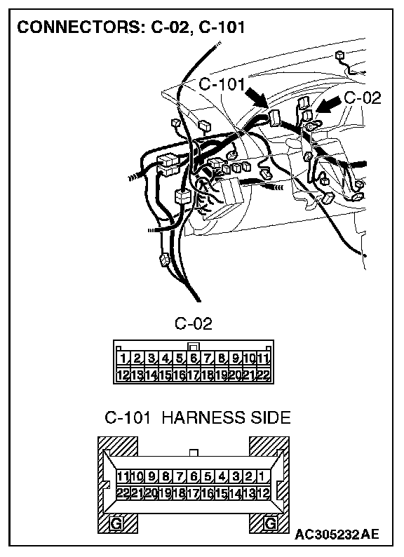 1. Disconnect joint connector (3) C-02 and combination meter connector C-101, and measure the resistance at the wiring harness side of joint connector (3) C-02.