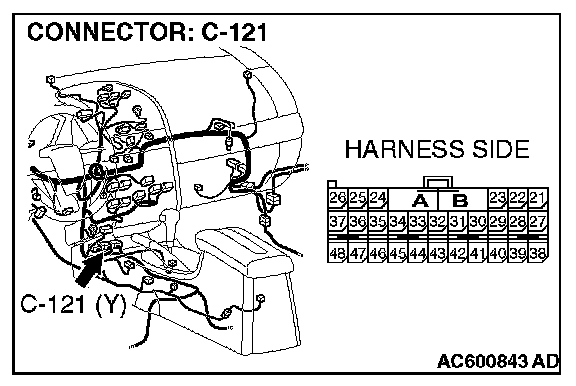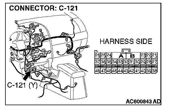STEP 42. Check SRS-ECU connector C-121 for loose, corroded or damaged terminals, or terminals pushed back in the connector.