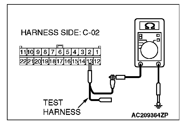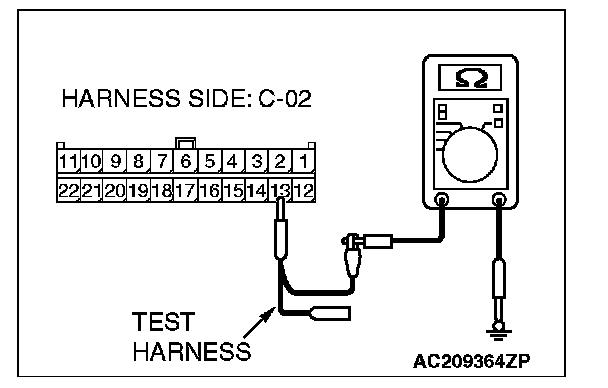 5. Measure the resistance between special tool MB991997 (ASC check harness) connector terminal 13 and body ground.