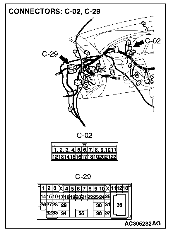 1. Disconnect intermediate connector C-29 and joint connector (3) C-02, and measure the resistance at the wiring harness side of joint connector (3) C-02.