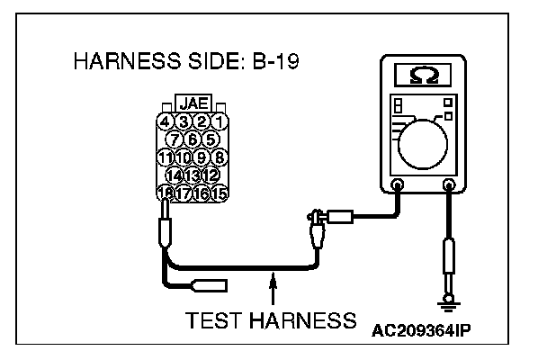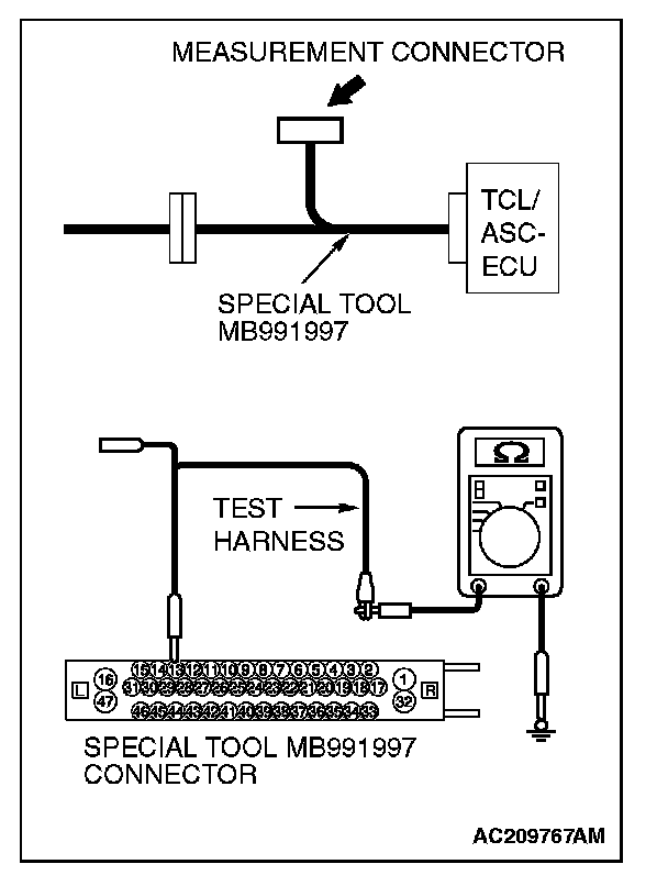2. Connect special tool MB991997 (ASC check harness) to the TCL/ASC-ECU and the wiring harness, and measure the resistance at special tool MB991997 (ASC check harness).