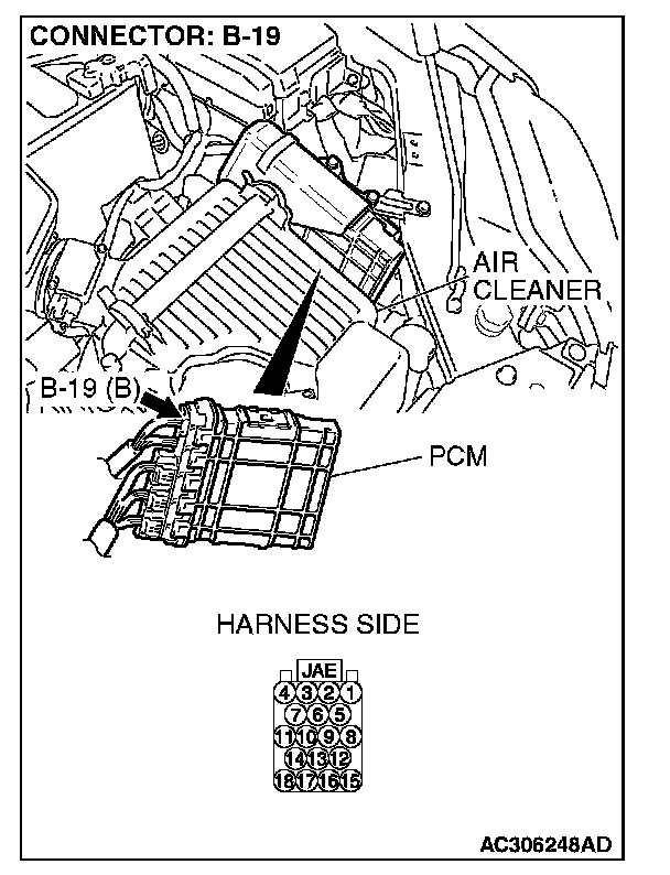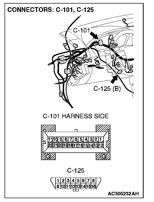 STEP 1. Check powertrain control module connector B-19, combination meter connector C-101 and data link connector C-125 for loose, corroded or damaged terminals, or terminals pushed back in the connector.