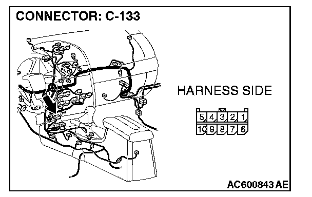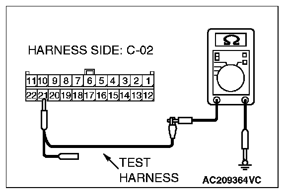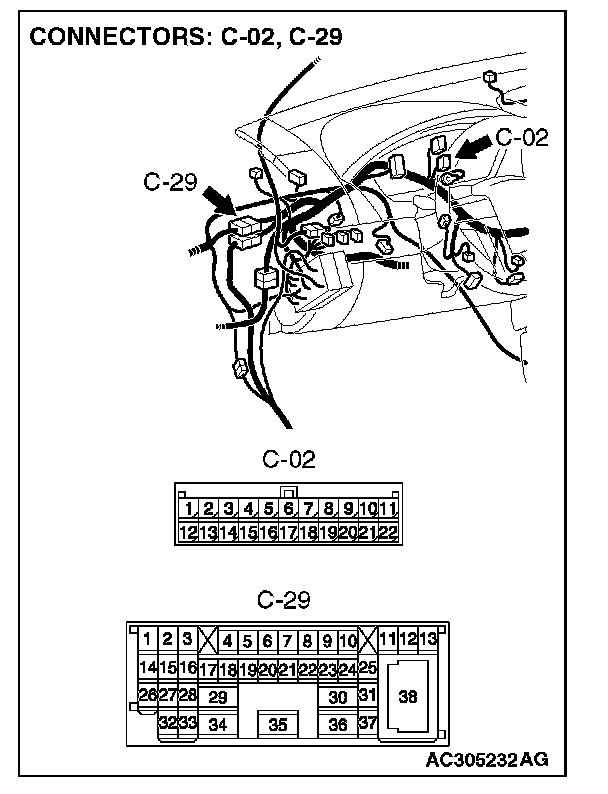 1. Disconnect joint connector (3) C-02 and multi-center display unit connector C-31 [Mitsubishi Multi Communication System], and measure the resistance at the wiring harness side of joint connector (3) C-02.